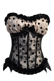 Корсет из гладкой атласной ткани кремого цвета в крупны черный горох. В области талии расшит тонким полу-прозрачным кружевом. Лиф из блестящей атласнй ткани с рюшами. Очень женственный утонченный и романтичный наряд. Идеально подойдет для вечернего образа.