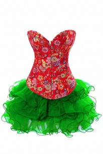 Красный корсет из плотной джинсовой ткани с подкладкой из натурального хлопка с пышной зеленой юбкой. Ярко-красного цвета с цветочным орнаментом, этот корсет выглядит одновременно классически и современно. Такую модель можно носить как с джинсами, так и с любыми брюками или юбкой. В подобном ансамбле является по истине эффектным, контрастным и очень оригинальным вечерним нарядом. Корсет позволяет достичь утяжки 5-7 см. Имеет хлопковую подложку под шнуровкой. Таким образом, даже если корсет очень сильно затянут, ваша спина будет закрыта и все складки, образующиеся при утягивании, будут спрятаны